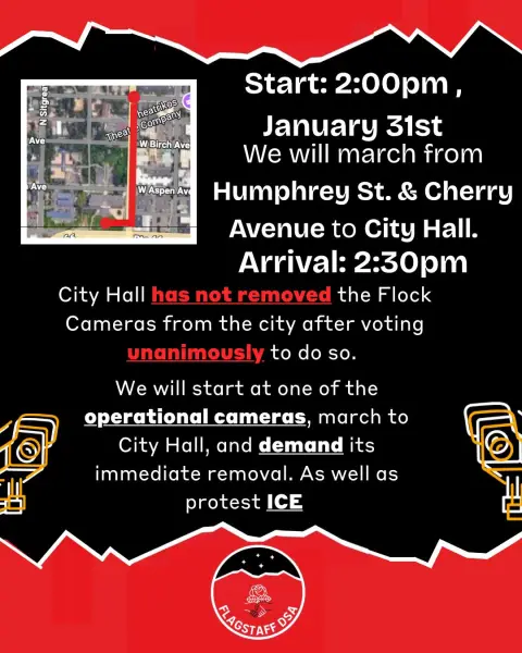FLAGSTAFF — Protesters marched down Humphrey Street (video) to the Flagstaff City Hall on Saturday, Jan. 31, 2026 to celebrate the ongoing removal of the City’s Flock surveillance cameras and to protest against ICE enforcement actions in Minneapolis, Minn. and other cities across the nation.