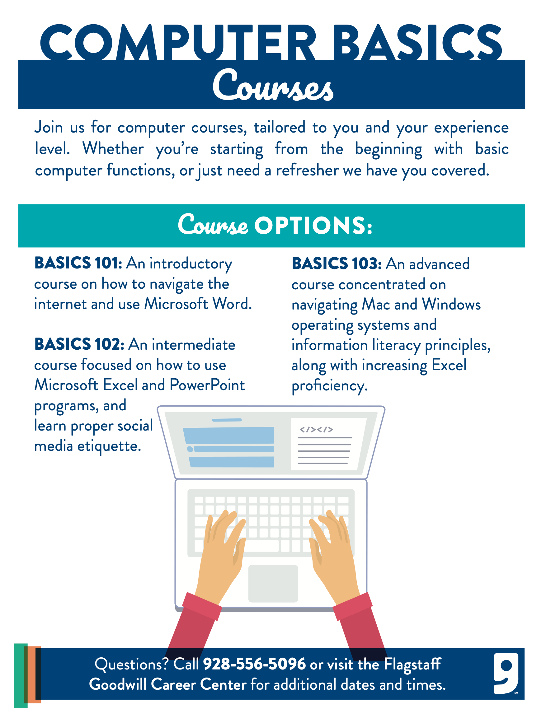 Below is the schedule of upcoming Goodwill Workshops! For details on signing up, please call 928-556-5096 or come in the Career Center to register. Note that our classes and workshops will be offered only Virtually until further notice, and space is limited. Select courses are also offered on My Career Advisor.